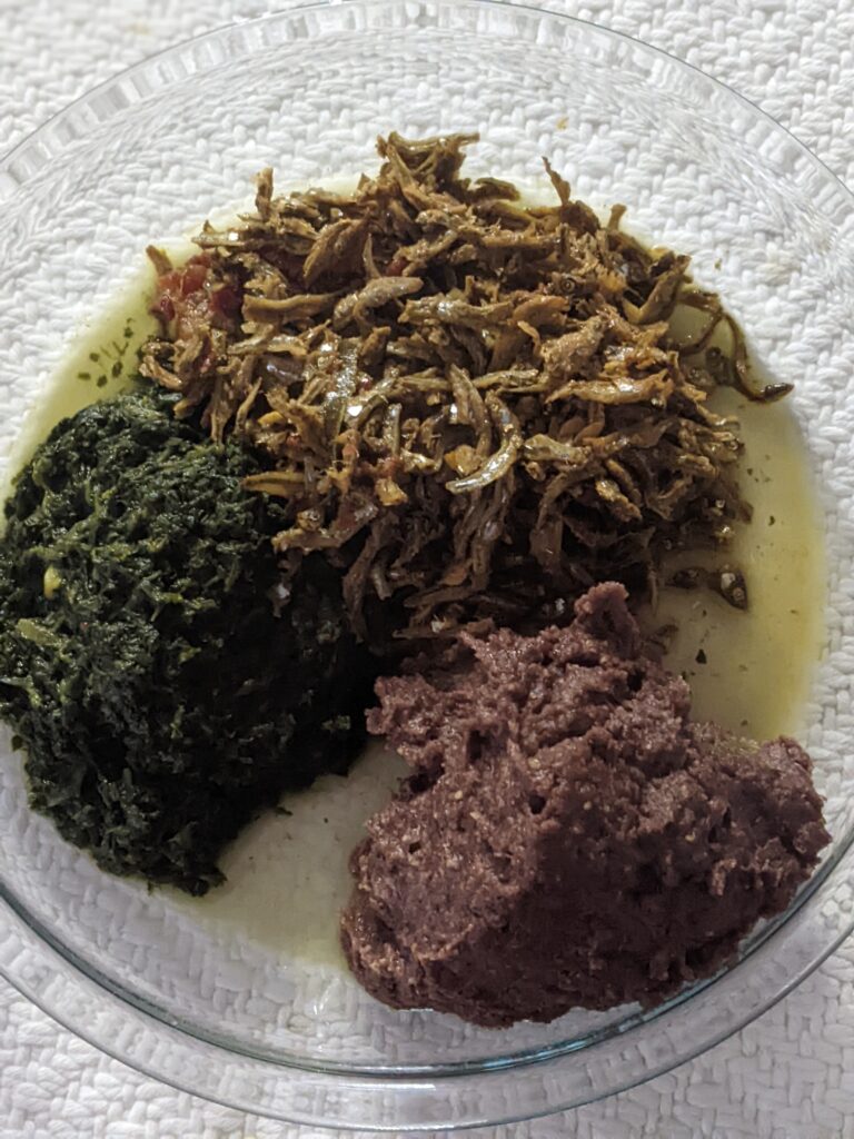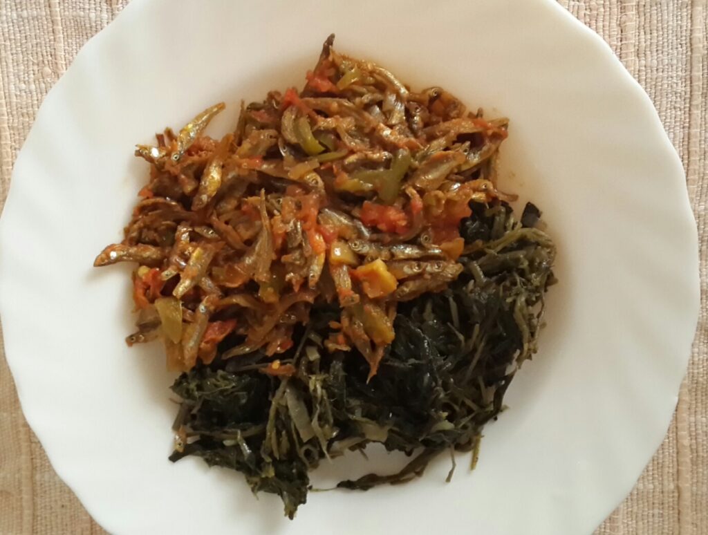 Now that your stewed omena is ready, you may serve it with green vegetables and ugali. Ugali: millet or corn, maize ugali with its mild taste and hearty texture, balances the rich flavors of the stew perfectly. And what better way to add some greens to your meal than with a side of fried vegetables like spinach, kale or other vegetables common in your city. They bring colour, fiber, and all those good vitamins to your plate.